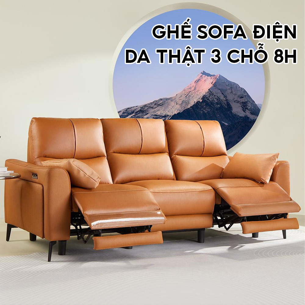 Ghế sofa điện 3 chỗ 8H được làm từ chất liệu da bò thật chất lượng cao của Ý cùng 2 vị trí kê chân tiện lợi sẽ mang lại những giây phút thư giãn, nghỉ ngơi thoải mái nhất cho bạn và gia đình.