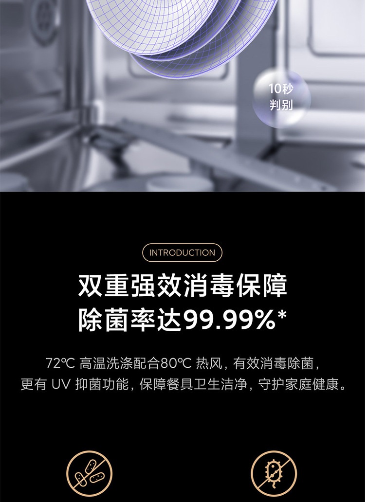Thêm vào đó, sấy khô bằng không khí nóng ở nhiệt độ 72 ° C (~ 162 ° F) mang lại tỷ lệ khử trùng đến 99,99%. Cảm biến AI có thể phát hiện mức độ bẩn trên bát đĩa trong 10 giây. Điều này cho phép Máy rửa bát đĩa thông minh Mijia S1 chọn chương trình rửa tối ưu một cách thông minh, điều chỉnh thời gian chu trình khi cần thiết.
